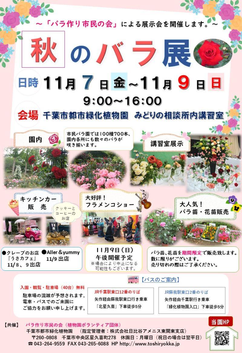 「市民バラ園」での秋バラの観賞や講習室での「バラの展示」 、「バラ苗や花苗の販売(期間限定)」など盛りだくさんの内容となっております。