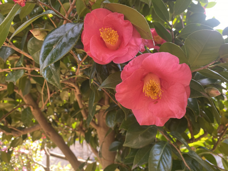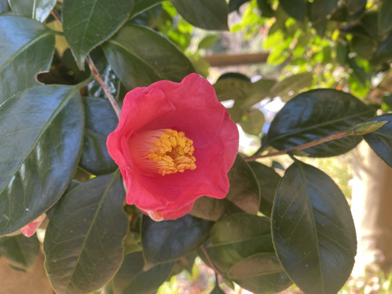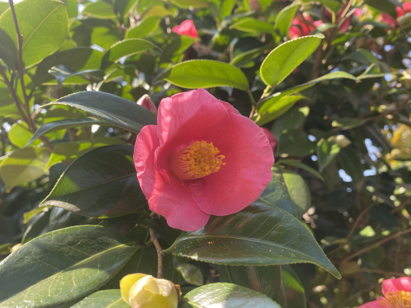 ツバキ科ツバキ属の常緑高木で、光沢のある濃い緑の葉をもちます。