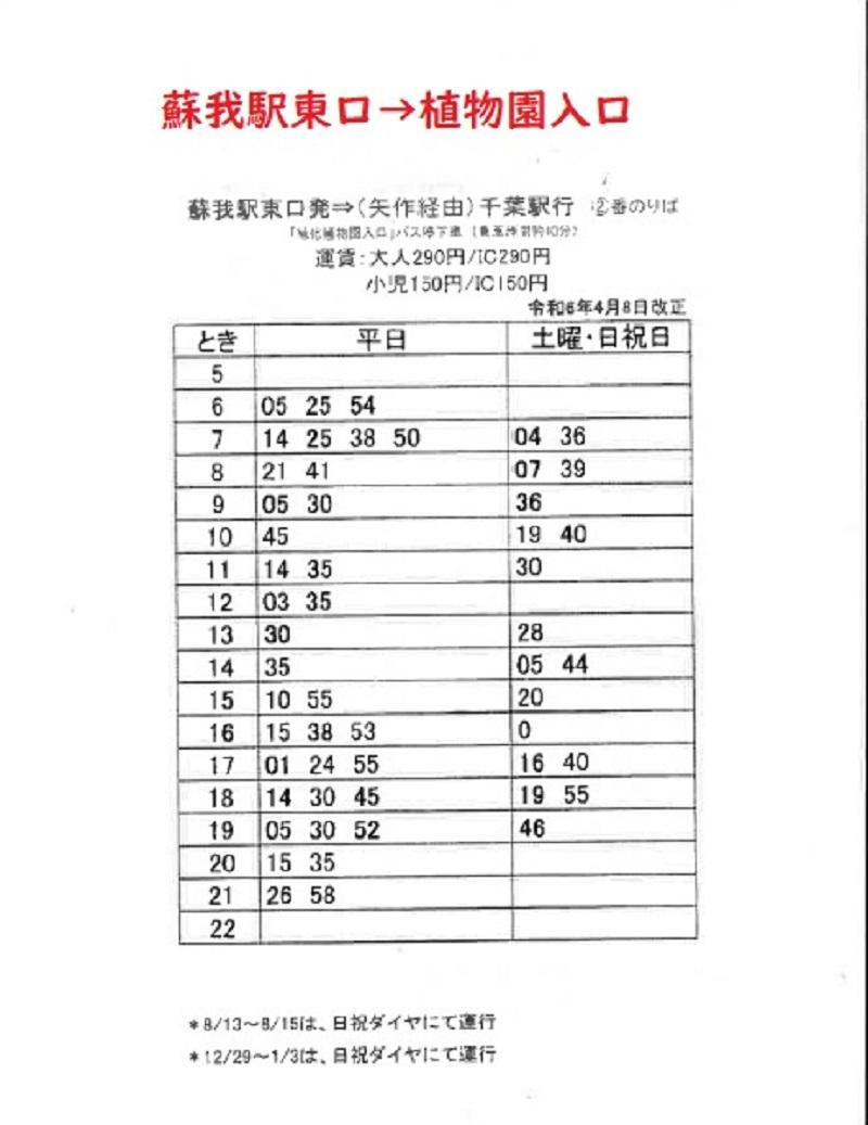 JR蘇我駅東口2番乗場 京成バス千葉イースト・小湊バス「矢作経由JR千葉駅」行き乗車(約15分)、「緑化植物園入口」バス停下車徒歩5分