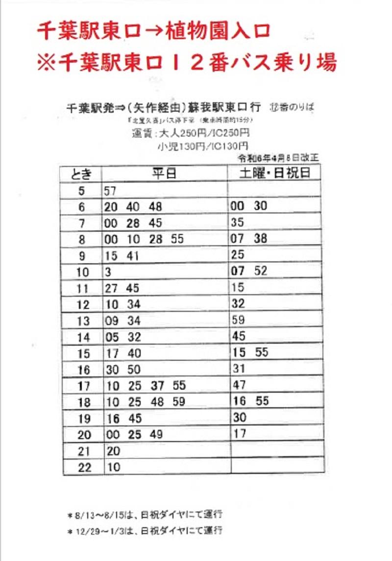 JR千葉駅東口12番乗場 京成バス千葉イースト・小湊バス「矢作経由蘇我駅東口」行き乗車(約15分)、「緑化植物園入口」バス停下車徒歩5分