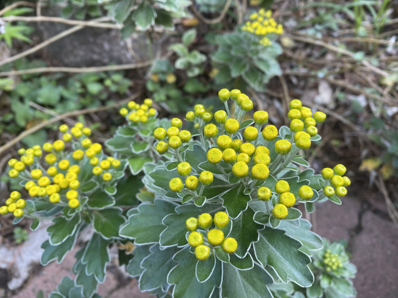 千葉県犬吠埼から静岡県御前崎、伊豆諸島に自生する多年草。葉裏にびっしり生えた毛は海岸の環境に対応したものと言われる。葉の緑が白い線で縁取られている。一般の菊の花は、舌状花と筒状花で構成させれるがイソギクは筒状花のみである。